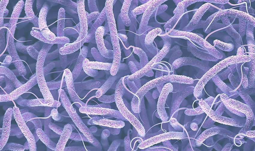 Vibrio cholerae, Gram-negative bacteria. 3D illustration of bacteria with flagella.