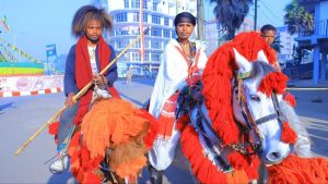 ክብረ በዓላቸውን የሚያደምቁት ፈረሰኞችም በጠዋቱ በእንጅባራ ጎዳናዎች እየተዘዋወሩ ትርኢታቸውን እያሳዩ ወደ ሜዳ በመውረድ ላይ ናቸው።