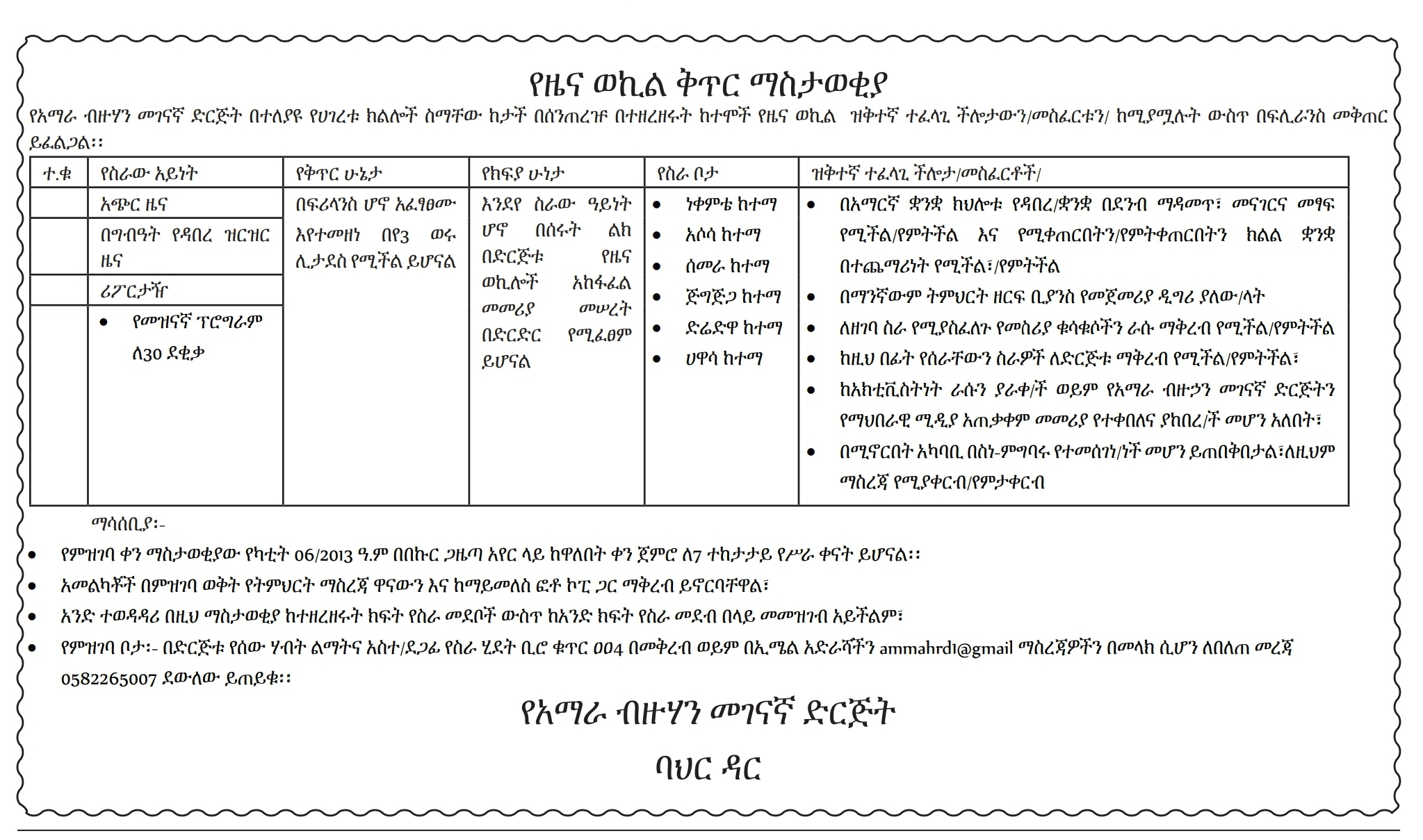 ክፍት የስራ ቦታ የዜና ወኪል ቅጥር ማስታወቂያ March 15, 2021 4871 የአማራ ብዙሃን መገናኛ ድርጅት በተለያዩ የሀገረቱ ክልሎች ስማቸው ከታች በሰንጠረዡ በተዘረዘሩት ከተሞች የዜና ወኪል ዝቅተኛ ተፈላጊ ችሎታውን/መስፈርቱን/ ከሚያሟሉት ውስጥ በፍሊራንስ መቅጠር ይፈልጋል፡፡ ተዛማች ዜናዎች:በምዕራብ ጎንደር ያለው ሃብት ከሀገር አልፎ አህጉርን መመገብ የሚያስችል ነው።