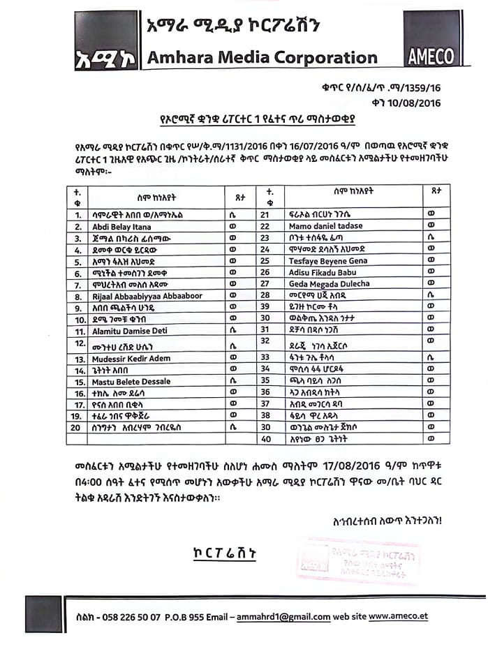 ክፍት የስራ ቦታ የፈተና ጥሪ ማስታወቂያ April 18, 2024 205 የአማራ ሚዲያ ኮርፖሬሽን በቁጥር የሠ/ቅ.ማ/1131/2016 በቀን 16/07/2016 ዓ/ም በወጣዉ የአሮሚኛ ቋንቋ ሪፖርተር 1 ጊዜአዊ የአጭር ጊዜ /ኮንትራት/ ሠራተኛ ቅጥር ማስታወቂያ ላይ መስፈርቱን አሟልታችሁ የተመዘገባችሁ ማለትም፡- ተዛማች ዜናዎች:በ2018 የትምህርት ዘመን 2 ነጥብ 8 ሚሊዮን ተማሪዎችን ለመመገብ ማቀዱን የአማራ…