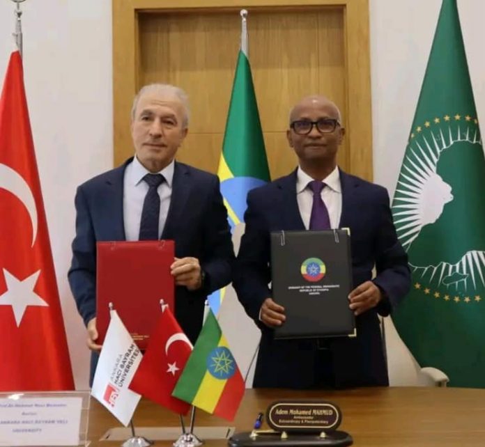 ባሕር ዳር: ሚያዚያ 18/2016 ዓ.ም (አሚኮ) አዲስ አበባ ዩኒቨርሲቲ ከአንካራ ሐጂ ባይራም ቬሊ ዩኒቨርሲቲ ጋር በጋራ መሥራት የሚያስችላቸውን የመግባቢያ ስምምነት በዛሬው ዕለት ተፈራርመዋል። አዲስ አበባ ዩኒቨርስቲን ወክለው ከአንካራ ሐጂ ባይራም ቬሊ ዩኒቨርሲቲ ፕሬዚዳንት ፕሮፌሰር መህመት ናጂ ጋር ስምምነቱን የተፈራረሙት በቱርኪዬ የኢፌዲሪ ልዩ መልዕክተኛ እና ባለ ሙሉ ሥልጣን አምባሳደር አደም መሐመድ ናቸው።