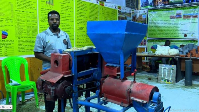 ወጣት ሙክታር ሁሴን በአማራ ብረታ ብረት ኮምቦልቻ የግብርና ግንባታ ማምረቻ ማዕከል የማርኬቲንግ ባለሙያ ሲኾን በድርጅቱ የተመረተ የፈጠራ ሥራን በሰመራ ሎጊያ በተዘጋጀ ኤግዚቢሽን ሲያሰተዋውቅ ነው አሚኮ ያገኘው።