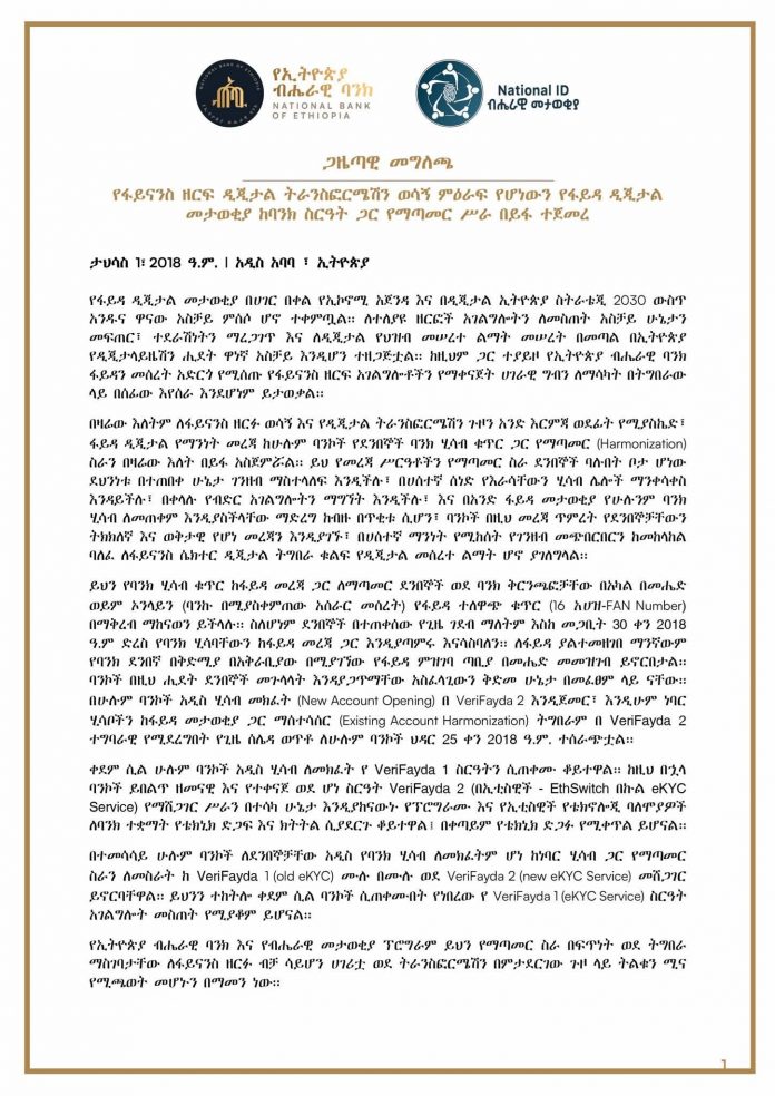 ዜናአማራኢትዮጵያየእለቱ አበይት ዜና የፋይዳ ዲጂታል መታወቂያን ከባንክ ሥርዓት ጋር የማጣመር ሥራ በይፋ ተጀመረ፡፡ December 10, 2025 44 ባሕር ዳር: ታኅሣሥ 01/2018 ዓ.ም (አሚኮ) የፋይናንስ ዘርፍ ዲጂታል ትራንስፎርሜሽን ወሳኝ ምዕራፍ የሆነው የፋይዳ ዲጂታል መታወቂያን ከባንክ ሥርዓት ጋር የማጣመር ሥራ በይፋ መጀመሩን የኢትዮጵያ ብሔራዊ ባንክ አስታወቀ። የአሚኮ ዲጂታል ሚዲያ ቤተሰብ ይሁኑ! https://linktr.ee/AmharaMediaCorporation ለኅብረተሰብ ለውጥ እንተጋለን! ተዛማች ዜናዎች:ማኅበረሰቡ ለሰላም አጋርነቱን ሊያሳይ ይገባል።