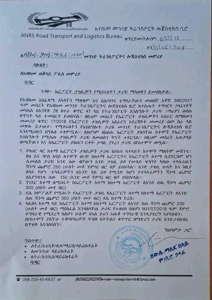 የወጣው መረጃ እንደሚያሳየው የአማራ ክልል መንገድ፣ ትራንስፖርት እና ሎጅስቲክስ ቢሮ ከተሰጡት ተግባር እና ኃላፊነቶች መካከል የትራንስፖርት አገልግሎት ታሪፍ ጣሪያ እና ወለል በጥናት ላይ ተመስርቶ ይወስናል።