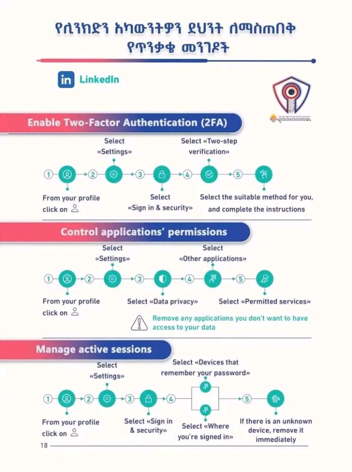 እርስዎም የሊንክዲን አካውንትዎ ደህንነት ለማስጠበቅ እንዲሁም ለጥቃት ቢጋለጥ እና ከእጅዎ ቢወጣ መልሶ ለማግኘት የሚከተሉትን መፍትሄዎች ይጠቀሙ፡፡