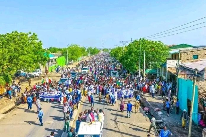 ባሕር ዳር: መጋቢት 28/2018 ዓ.ም (አሚኮ)በአፋር ክልል በአይሳኢታ ከተማ መጋቢት 24/ 2010 ዓ.ም የመጣውን ሀገራዊ ለውጥ ተከትሎ የተመዘገቡ ስኬቶችን ለማስቀጠል እና የለውጥ ጉዞውን በጽኑ መሠረት ላይ ለማቆም ያለመ ሕዝባዊ የድጋፍ ሰልፍ ተካሂዷል።