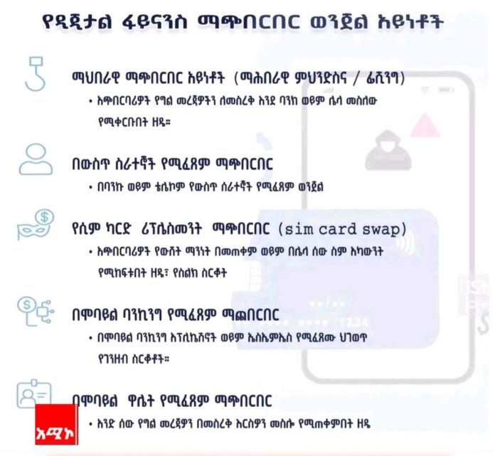 ባሕር ዳር: ሚያዚያ 05/2018 ዓ.ም (አሚኮ) የዲጂታል ፋይናንስ ማጭበርበር ማለት የዲጂታል መሳሪያዎችን በመጠቀም ሰዎችን በማታለል፣ የተሳሳተ መረጃ በመስጠት፣ የክፍያ ሥርዓቶችን በመጣስ እና መረጃ በመስረቅ ያልተገባ የገንዘብ ጥቅም ለማግኘት የሚፈጸም ወንጀል ነው።