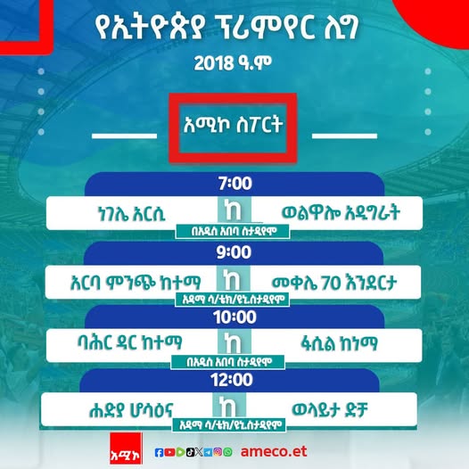ባሕር ዳር: ታኅሣሥ 15/2018 ዓ.ም (አሚኮ) በኢትዮጵያ ፕሪምየር ሊግ 11ኛ ሳምንት መርሐ ግብር ዛሬ የአማራ ክልል ተወካዮች እርስ በእርስ የሚያደርጉት ጨዋታ ተጠባቂ ነው። ጨዋታው በአዲስ አበባ ስታዲየም ቀን 10:00 ይደረጋል።