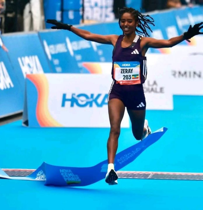 በፈረንሳይ ዴ ሁካ ሰሚ ደ ፓሪስ የግማሽ ማራቶን አትሌት ፍታው ዘርኣይ በቀዳሚነት ውድድራን ፈፅማለች ።
